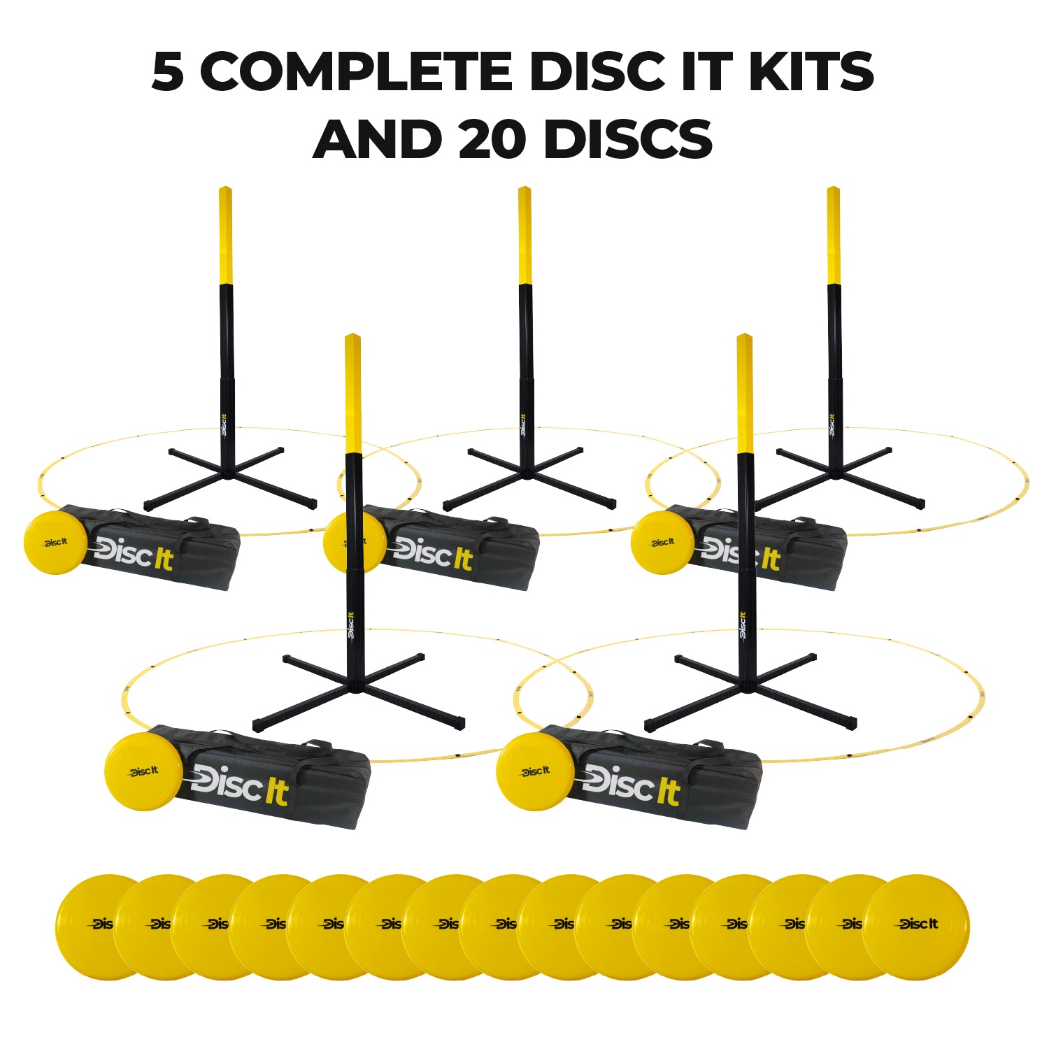 Take Disc It to the next level with our biggest bundle — built for schools, colleges, and camps with large groups. With 5 complete Disc It kits and 20 extra discs, your program can engage up to 50 players simultaneously while keeping gameplay fast, fair, and competitive. The extra discs make it easy to keep everyone engaged — players can run throwing and catching drills while waiting to rotate in. And since Disc It games only last 10–15 minutes, downtime stays short and the action keeps moving.